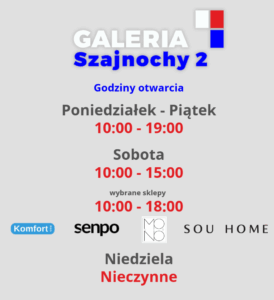 Wybrane sklepy otwarte dłużej w sobotę Od października 2025 roku niżej wymienione sklepy w sobotę otwarte są dłużej. Zakupy możecie Państwo zrobić w godzinach 10:00 – 18:00: – Komfort – Senpo – Moderno Meble – Sou Home